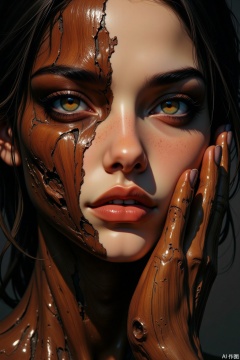 A depiction of a young woman with parts of her body, perhaps her hands or sections of her face, appearing as if made from polished, dark wood, complete with visible grain and knots, seamlessly integrated with her human flesh. Close-up or half-body. The artwork emphasizes the rich, smooth texture of the polished wood blending with the soft texture of her skin. Warm, directional lighting highlights the wood grain and the contours of her form. Her eyes possess a deep, earthy glow.