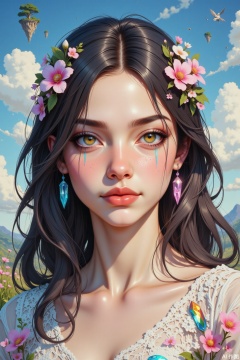 A young woman whose tears are tiny, perfectly formed, prismatic crystals that catch and refract light into miniature rainbows. She is depicted in a dreamlike, illustrative landscape where the sky is a swirl of pastel colors and floating islands. The overall rendering is soft and whimsical, with a storybook feel. The crystals have a sharp, faceted texture contrasting with her softly painted features. The scene is bathed in a gentle, magical glow.