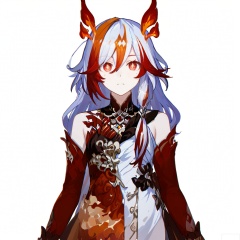 looking at viewer,fu hua bengluo,fu hua,messy hair,jewelry,twintails,eyelashes,facial mark,head wings,two-tone hair,twintails,tatto,bangs,white hair,orange eyes,streaked hair,orange hair,fiery hair,hair between eyes,multicolored hair,hair ornament,hair ribbon,pattern on hair,yellow pupils,diamond shaped pupils