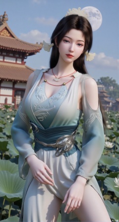 BREAK,blurry, solo focus, long hair, lips, daytime, lipstick, outdoors, standing,upper body,(huge breasts:2.99), (full breasts:2.99),background, solo, makeup,Xyunxiao,(Lotus,Water Lily,Blue sky,full moon:1.39),(Lotus pond,ancient Chinese architecture:1.39),Xmupeiling,XsongyuYK