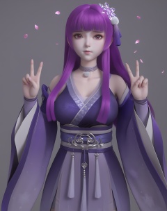 (score_9),vivid colours,Expressiveh,ambient occlusion,((Subsurface Scattering)),light blush,body blush,<lora:叶紫云-Apony-000009:0.82>,yeziyun,1girl,solo,long hair,purple hair,blunt bangs,hair ornament,choker,snowflake hair ornament,long eyelashes,purple eyes,hanfu,detached sleeves,belt,wide sleeves,sash tassel,sleeve tassel,skirt,purple sash,looking at viewer,front view,facing viewer,collarbone,puffy breasts,pointy_breasts,large breasts,see-through cleavage,<lora:a修手:0.35>,double v,twig,falling petals,grey background,<lora:perfect-eyes:0.8>,<lora:e色温:0.5>,<lora:Expressive_H:0.8>,<lora:e肤色滑块:0.5>,<lora:SkinRealityOrg_ponyv6_loraplus:0.25>,real skin,OverallDetail,fair_skin,(white_skin),(Ivory_skin),