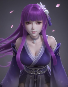 (score_9),vivid colours,Expressiveh,ambient occlusion,((Subsurface Scattering)),light blush,body blush,<lora:叶紫云-Apony-000008:0.82>,yeziyun,1girl,solo,long hair,purple hair,blunt bangs,hair ornament,choker,snowflake hair ornament,long eyelashes,purple eyes,hanfu,detached sleeves,belt,wide sleeves,sash tassel,sleeve tassel,thighhighs,skirt,purple sash,looking at viewer,front view,facing viewer,collarbone,puffy breasts,pointy_breasts,large breasts,see-through cleavage,<lora:a修手:0.35>,twig,falling petals,grey background,rim light,Volumetric Lighting,Tyndall effect,bokeh,<lora:perfect-eyes:0.8>,<lora:e色温:0.5>,<lora:Expressive_H:0.8>,<lora:e肤色滑块:0.5>,<lora:SkinRealityOrg_ponyv6_loraplus:0.25>,real skin,OverallDetail,fair_skin,(white_skin),(Ivory_skin),