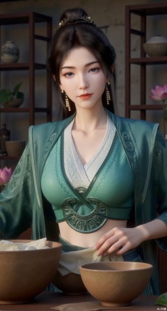 (masterpiece:1.2),best quality,A digital CGI image portrays a fair-skinned Chinese woman with jet-black hair elegantly styled in a chignon. She wears a traditional Chinese cheongsam featuring intricate floral patterns. The scene captures her wrapping zongzi at a rustic wooden table, surrounded by lush green leaves and bowls filled with glutinous rice. The environment is rich with details, including the texture of the table, the vivid colors of the leaves, and the warm tones of the room, emphasizing the festive ambiance of the Dragon Boat Festival.(huge breasts:2.99),(full breasts:2.99),(Background with traditional Chinese architecture, lotus pond and pink lotus flowers:1.39),Xmupeiling,XsongyuYK