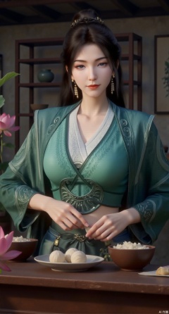 (masterpiece:1.2),best quality,A digital CGI image portrays a fair-skinned Chinese woman with jet-black hair elegantly styled in a chignon. She wears a traditional Chinese cheongsam featuring intricate floral patterns. The scene captures her wrapping zongzi at a rustic wooden table, surrounded by lush green leaves and bowls filled with glutinous rice. The environment is rich with details, including the texture of the table, the vivid colors of the leaves, and the warm tones of the room, emphasizing the festive ambiance of the Dragon Boat Festival.(huge breasts:2.99),(full breasts:2.99),(Background with traditional Chinese architecture, lotus pond and pink lotus flowers:1.39),Xmupeiling,XsongyuYK