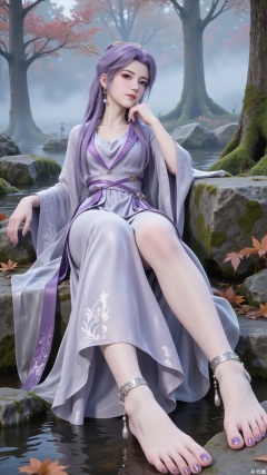 - Accessories: Wears a silver anklet on the ankle, with small diamonds and pendants on it. Toenails are painted with purple transparent glittery nail polish. Bare - footed.