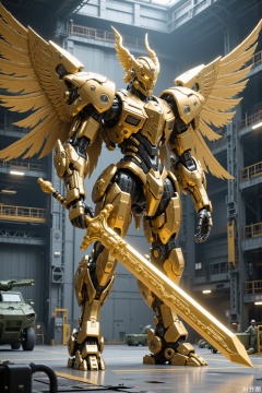 A futuristic giant mecha, Chinese Taoist style, integrating Chinese mythological elements, God of War mecha, sacred gold, deconstructed layout, rich details, strong sense of layering, extremely fine, complex parts, realistic style, giant four-winged angel wings, god helmet, metal texture, cool tone, precision machinery, sense of technology, dynamic stillness, clear light and shadow, futurism. The future mecha knight, sacred golden, holding a giant golden holy sword in hand, with high definition details, metal texture and tension composition, grand scenes, surrealism, real texture, OC rendering, huge military factory apron,gd