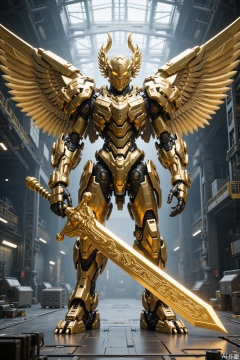A futuristic giant mecha, Chinese Taoist style, integrating Chinese mythological elements, God of War mecha, sacred gold, deconstructed layout, rich details, strong sense of layering, extremely fine, complex parts, realistic style, giant four-winged angel wings, god helmet, metal texture, cool tone, precision machinery, sense of technology, dynamic stillness, clear light and shadow, futurism. The future mecha knight, sacred golden, holding a giant golden holy sword in hand, with high definition details, metal texture and tension composition, grand scenes, surrealism, real texture, OC rendering, huge military factory apron,gd