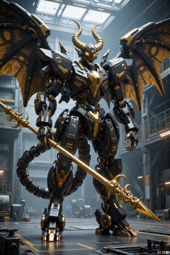 A futuristic giant mecha, Demon Slayer War God Mecha, Dark Gold and Black, deconstructed layout, rich details, strong layering, extremely fine, complex parts, realistic style, giant mechanical wings, demon helmet, metal texture, cool tone, precision machinery, technological sense, dynamic stillness, clear light and shadow, futuristic. The future mecha knight, with terrifying demon wings, dark gold and black, holding two super large ornate giant spears in hand, with high definition details, metal texture and tension composition, grand scenes, surrealism, real texture, OC rendering, 3D, super HD16k — s 800 — niji 6, huge military factory apron,gd,