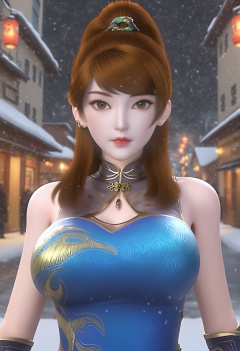 (score_9),<lora:肖凝儿-Apony-000008:0.85>,xiaoninger,solo,1girl,brown hair,long hair,ponytail,brown eyes,hair rings,jewelry,ear piercing,mole under eye,lipstick,cocked eyebrow,china dress,high collar,bracer,side slit,<lora:perfect-eyes:0.8>,light blush,body blush,looking at viewer,front view,(bangs_pinned_back:1.1),mature,glamor,collarbone,puffy breasts,pointy_breasts,large breasts,street,(snow,ice:1.1),OverallDetail,(white_skin),(Ivory_skin),fair skin,<lora:e色温:0.5>,<lora:e肤色滑块:0.5>,