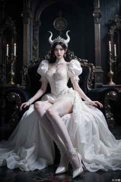 Demon princess, white small demon horns, white dress, white stockings, perfect figure, big breasts, thin waist, long legs, elegant sitting on the throne, Cross-legged,elegant pose, sexy pose, emn, yyzs