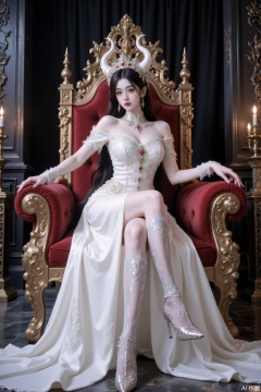 Demon princess, white small demon horns, white dress, white stockings, perfect figure, big breasts, thin waist, long legs, elegant sitting on the throne, Cross your legs, one on top of the other.,elegant pose, sexy pose, emn, yyzs,cy