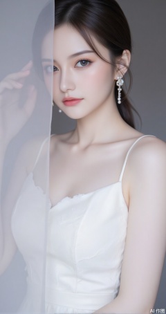 dress, wedding dress, 1girl, white dress, solo, indoors, long dress,1, cover,simple background,gradient background,close-up details,outstanding style,adding a touch of dimension to your images without compromising details,close-up