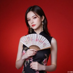 dress, wedding dress, 1girl,dress,hand fan,holding,solo,earrings,jewelry,chinese clothes,china dress,black dress,holding fan,floral print,blurry,sleeveless,looking at viewer,sleeveless dress,red background,folding fan,standing,head tilt,2,cover,simple background,gradient background,close-up details,outstanding style,adding a touch of dimension to your images without compromising details,close-up