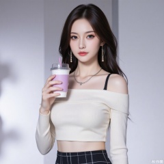1girl,solo,skirt,off shoulder,off-shoulder sweater,jewelry,white sweater,necklace,cup,bare shoulders,holding,sweater,disposable cup,breasts,black skirt,plaid skirt,collarbone,plaid,blurry background,crop top,holding cup,blurry,midriff,long sleeves,large breasts,63, cover,simple background,gradient background,close-up details,outstanding style,adding a touch of dimension to your images without compromising details,close-up