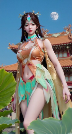 BREAK,blurry, solo focus, long hair, lips, daytime, lipstick, outdoors, standing,upper body,(huge breasts:2.99), (full breasts:2.99),background, solo, makeup,Xyunxiao,(Lotus,Water Lily,Blue sky,full moon:1.39),(Lotus pond,ancient Chinese architecture:1.39),Xmupeiling,XsongyuYK,XqiyueFHK