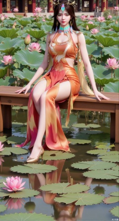 (masterpiece:1.2),best quality,The image is a digital illustration of a young woman sitting on a wooden bench in a pond with lily pads. She is wearing a long dress with design on the chest and sleeves. The dress has a high neckline and short sleeves,Holding a lotus in hand. She has long dark hair styled in loose waves and is wearing gold high heels. The woman is posing with one hand on her hip and the other resting on the edge of the bench. The background is filled with pink and white lotus flowers and green leaves. The overall mood of the image is peaceful and serene,(huge breasts:2.99),(full breasts:2.99),(Background with traditional Chinese architecture, lotus pond and pink lotus flowers:1.39),Xmupeiling,XsongyuYK,XqiyueFHK