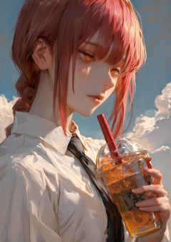 best quality,masterpiece,absurdres,newest,<lora:ATNR_V1.1_Lokr_f4_warmup_stable_decay:0.8>,(atnr),This is a digital illustration in a graphic novel style, featuring a desaturated color palette dominated by black, white, deep reds, and greys, with sharp line work defining the character and realistic texture rendering; the character exhibits visible, somewhat textured brushstrokes for rendering,This is a digital illustration rendered in a distinct anime style, closely resembling the art style of the manga/anime 'Chainsaw Man'. The color palette features naturalistic tones for the character (skin, hair, clothing) set against a bright blue sky with stylized orange cloud or energy accents. The line work is clean and confident, and the shading employs a mix of cell-shading principles with soft gradients, typical of modern, high-quality anime illustrations.The image utilizes strong lighting, consistent with bright daylight, creating clear highlights and defined, though subtly rendered, shadows.This striking digital illustration depicts the character Makima from 'Chainsaw Man'. She has distinctive pinkish-red hair styled in a braid and unique golden eyes with concentric ring patterns. Dressed in a formal black suit, white button-up shirt, and black tie, she strikes a confident, almost commanding pose, looking down slightly towards the viewer with a calm, penetrating gaze. One hand holds a cup of bubble tea, while the other is raised, index finger pointing upwards. The background consists of a bright blue sky filled with white clouds and punctuated by sharp, abstract orange shapes, adding a dynamic and slightly surreal element to the composition. Her expression and posture convey an aura of control and subtle authority, despite the casual element of the drink.