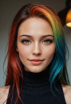 score_9, score_8_up,score_7_up,source_photo, source_real, (close-up photography, masterpiece, best quality, ultra-detailed, realistic), realism, highly detailed, lifelike, cinematic lighting, absurdres, cinematic still of a young woman posing for the camera in a ribbed black sweater, 1girl, solo, long hair, detailed hair, detailed face, detailed skin, looking at viewer, rainbow hair, sleeveless, green eyes, parted lips, upper body, emotional, aesthetics, detailed eyes, perfect composition, gigantic breasts, flash photography, perfect eyes. blushing, high cheekbones, seductive smile, perfect eyes, detailed background