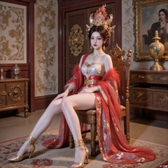 Cultivation style, a beautiful woman sitting on a wooden chair in an antique room, sexy pose, elegant pose, colorful clothes, feathered clothes, phoenix crown and robe, .em,gd,xz,cy,yyzs,mn,sw,fgxp