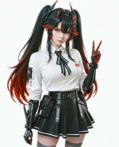 amazing realistic sakuga, game trailer, cowboy shot, looks at the viewer, mechanical arms,1girl,solo,lucia \(punishing: gray raven\),collared shirt,black hair,lucia: dawn \(gray feathers: dawn\) \(punishing: gray raven\),official alternate costume,gradient hair,shirt,sidelocks,black skirt,v,punishing: gray raven,white shirt,long hair,hair ornament,hair between eyes,red hair,grey thighhighs,parted bangs,streaked hair,x hair ornament,multicolored hair,red eyes,white background,highres,skirt,twintails,thighhighs,gou bao, caustic light, 3d by nyl2, realistic shiny skin, glistering fuzzy fur.