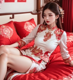 1girl,jewelry,red_lips_,lipstick,applying_makeup,eye makeup,black hair,solo,dress,china_dress,<lora:坐在床上中式新娘1.1:0.8>,sitting_on_bed,<lora:汉服眼妆1.3:0.5>,diamond drop earrings,hair,hair bun,