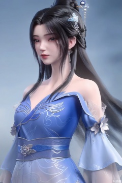 1girl, solo, long hair, black hair, hair ornament, looking at viewer,dress, bare shoulders, jewelry, upper body, blue dress, chinese clothes, sash, blue sash,