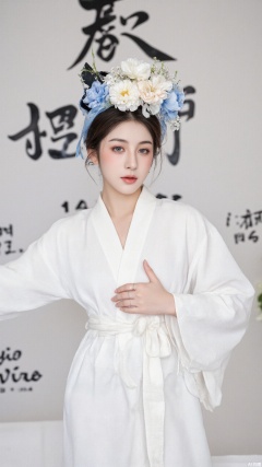 a young Asian woman dressed in a white kimono, adorned with a blue headband adorned with flowers. The woman's hair is dark brown, and her eyes are a piercing blue, while her hair is a darker shade of brown. She is wearing a silver ring on her left hand, adding a touch of contrast to her white robe. The backdrop is adorned with black writing, creating a striking contrast against the white backdrop.