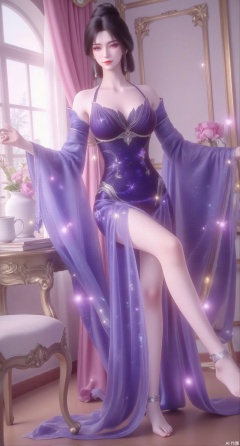 (masterpiece:1.2),Ultra clear, wallpaper, 8k, masterpiece, 1girl, solo, long hair, breasts, looking at viewer, bangs, large breasts,long dress,, bare shoulders, jewelry, black hair, standing, purple eyes, full body, flower, thighs, indoors, hair bun, long dress, high heels, cup, see-through, book, bare legs, window, table, white footwear, standing on one leg, curtains, pink flower, side slit, vase, ,(huge breasts:2.99),(full breasts:2.99),,Xmupeiling,XsongyuYK,XqiyueFHK,XheguangzhefandiYK,XxiaobaiNZYK,XlimuwanJCBYK
