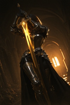 masterpiece,best quality,amazing quality,very aesthetic,absurdres,newest,extreme aesthetic,in the style of fashion photography,light particles,cinematic lighting,Visual impact,sharp focus,Emotionalization,depth of field,dutch angle,scenery,intense light,golden light in the dark,girl holding the sword,tight armor,intricate textures,real metal material,