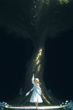 (lumine \(genshin impact\):0.751315),swav,(as109:0.8),(wlop:0.8),(ogipote:0.8),(misaka 12003-gou:0.65),(ningen mame:0.9),yoneyama mai,(torino aqua:0.8),binggong asylum,(piromizu:0.7),ciloranko,(wanke:0.8),sankyo,(821-scoville:1.1),shadow,light rays,(close-up:1.948717),blonde hair,backlighting,sidelocks,short hair with long locks,sleeveless dress,outdoors,floating hair,from behind,floating clothes,dress,solo focus,light particles,sleeveless,flower,standing,very wide shot,sunbeam,long hair,facing away,white flower,bare shoulders,arm up,shade,sunlight,dappled sunlight,white dress,long sleeves,tree shade,black background,arm at side,day,masterpiece,masterpiece,best quality,newest,highres,absurdres,sensitive,
