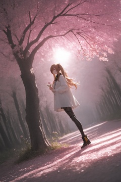 ump9 \(girls' frontline\),girls' frontline,standing under the cherry tree,ready to pick flowers,masterpiece,best quality,amazing quality,very aesthetic,absurdres,newest,in the style of fashion photography,light particles,cinematic lighting,Visual impact,sharp focus,Emotionalization,impactful picture,lens flare,depth of field,dynamic pose,dutch angle,extreme aesthetic,