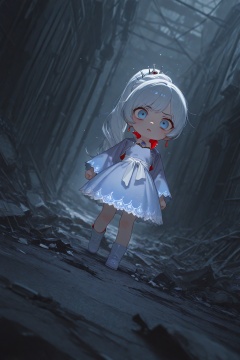 masterpiece,best quality,amazing quality,very aesthetic,absurdres,newest,extreme aesthetic,light particles,sharp focus,Emotionalization,depth of field,dutch angle,{{artist:toddler}},artist:henreader,artist:ciloranko,[artist:sho_(sho_lwlw)],[[tianliang duohe fangdongye]],1girl,weiss schnee,rwby,scary scenes,an eerie scene,broken scene,chibi,