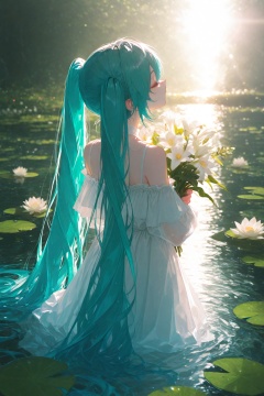 hycg,hysp,dynamic_outline,1girl,solo,long hair,bangs,dress,holding,bare shoulders,twintails,very long hair,closed eyes,flower,water,off shoulder,from behind,white dress,aqua hair,leaf,sunlight,white flower,lens flare,bouquet,off-shoulder dress,holding flower,holding bouquet,lily pad,hatsune miku,(artist:quasarcake:0.6),extreme aesthetic,masterpiece,best quality,backlight,high quality,(Tyndall Effect 1.4),extremely detailed,High Detail,vibrant colors,anime style,cover art,(wanke:0.8),(watercolor \(tira 7:0.8),(lam (ramdayo):0.8),(mochizuki kei:0.8),extreme aesthetic,masterpiece,best quality,good quality,newest,very aesthetic,absurdres,Visual impact,32K UHD,colorful,sharp focus,