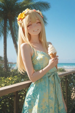 masterpiece, best quality, amazing quality, very aesthetic, absurdres, highres, newest, 2024, HDR, 8K, high detailed, detailed background, subtle lighting, masterful shading,1gilr, long hair, straight hair, blonde hair, smile, holding an ice cream cone in her hand and smiling, outdoors, set outside a cafe, blue sky, coastline, palm tree, She has a flower on her head and is wearing a colorful dress, summer dress, upper body, cowboy shot,