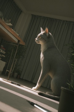 masterpiece,best quality,amazing quality,very aesthetic,absurdres,newest,in the style of fashion photography,light particles,cinematic lighting,Visual impact,sharp focus,Emotionalization,depth of field,dutch angle,extreme aesthetic,scenery,animal,gray cat,solo,table,stationery,books,curtains,windows,potted plants,balcony,