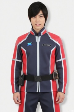 looking at viewer,XIO,collar,belt,logo,uniform,jacket,pants,gloves,boots,emblem,blue jacket,blue pants,blue jacket with grey line,blue pants with gray line