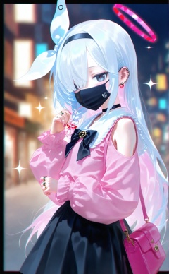 nyalia, 1girl, solo, halo, plana (blue archive), black mask, skirt, long hair, mask, mouth mask, black skirt, hair over one eye, ear piercing, black eyes, red halo, piercing, black hairband, long sleeves, pink shirt, shirt, jirai kei, looking at viewer, bag, pink hair, hairband, alternate costume, choker, white hair, shoulder bag, cowboy shot, black choker, colored inner hair, multicolored hair, pink halo, pleated skirt, ring, puffy long sleeves, jewelry, bowtie, bow, blurry, frills, black bowtie, braid, pink bag, sailor collar, blurry background, black bow, single braid, ribbon, clothing cutout, white ribbon, blush, handbag, puffy sleeves, shoulder cutout, very long hair, miniskirt, earrings, red pupils, white sailor collar, two-tone hair, hair ribbon, bare shoulders, casual, high-waist skirt, grey hair, standing, grey eyes, white bow, sparkle, depth of field, sleeves past wrists, from side, hands up, arona (blue archive), hair bow, fingernails, multiple rings, one eye covered, outdoors, shirt tucked in, looking to the side, white bowtie, border, bow hairband, hand up, black border, pink nails, blue hair, side braid, nail polish<lora:nyalia Acid-000055:0.9>,