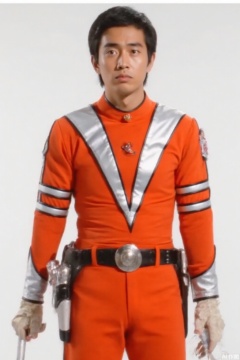 looking at viewer,MAC,helmet,orange pants,orange jacket,collar,belt,logo,uniform,jacket,gloves,boots,emblem,pants,white gloves,black footwear,orange jacket with Silver line