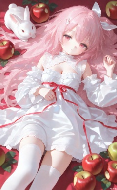 nyalia,1girl, solo, long hair, breasts, looking at viewer, hair ornament, thighhighs, dress, ribbon, cleavage, very long hair, pink hair, flower, lying, frills, detached sleeves, food, on back, white dress, red ribbon, fruit, animal, rabbit, apple