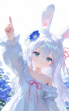nyalia,loli,1girl, animal ears, solo, dress, rabbit ears, ribbon, long hair, flower, white dress, hair flower, white hair, looking at viewer, hair ornament, long sleeves, red ribbon, white background, hair between eyes, off shoulder, white flower, blue eyes, puffy sleeves, collarbone, frills, white theme, hair ribbon, arm up, frilled dress, rabbit girl, parted lips, simple background, index finger raised, pink ribbon, upper body, very long hair, off-shoulder dress, breasts, animal ear fluff, juliet sleeves, neck ribbon, blush, aqua eyes, bare shoulders, green eyes, pointing, expressionless, medium breasts, pointing up, :o, floral background, closed mouth, hand up, grey eyes, blue flower