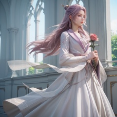 score_9,score_8_up,score_7_up,score_6_up,best quality,detailed clothes,masterpiece,8k,simple background,sfw,rim light,perfect hands,<lora:云霄-师兄啊师兄-pony:0.8>,yunxiao,1girl,dress,solo,hair ornament,long sleeves,wind,wind lift,indoors,((holding red rose)),in white palace,