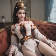 score_9,score_8_up,score_7_up,score_6_up,best quality,masterpiece,8k,simple background,sfw,bright,perfect hands,depth of field,<lora:酒玖-师兄啊师兄-pony:0.8>,jiujiu,1girl,solo,jewelry,forehead mark,earrings,dress,long hair,ponytail,hair ornament,closed mouth,looking at viewer,bare legs,pelvic curtain,makeup,lips,skinny,large breasts,slender body,(lying on couch:1.2),blue curtains,