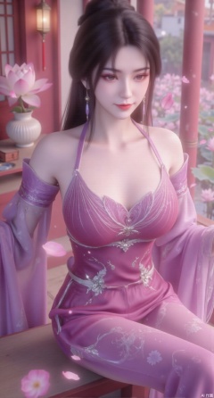 (masterpiece:1.2),best quality, (1girl:1.1), (dress:1.39), on Stomach,aqua_earrings,Lights, lanterns, chang,(big breasts:2.56),hanfu, Best quality, Realistic, photorealistic, masterpiece, extremely detailed CG unity 8k wallpaper, best illumination, best shadow, huge filesize ,(huge breasts:2.69) incredibly absurdres, absurdres, looking at viewer, transparent, smog, gauze, vase, petals, room, ancient Chinese style, detailed background, wide shot background, (((black hair))),(Sitting on the lotus pond porch:1.49) ,(A pond full of pink lotus flowers:1.5),close up of 1girl,Hairpins,hair ornament,hair wings,slim,narrow waist,perfect eyes,beautiful perfect face,pleasant smile,perfect female figure,detailed skin,charming,alluring,seductive,erotic,enchanting,delicate pattern,detailed complex and rich exquisite clothing detail,delicate intricate fabrics,Morning Serenade In the gentle morning glow, (a woman in a pink lotus-patterned Hanfu stands in an indoor courtyard:1.36),(Chinese traditional dragon and phoenix embroidered Hanfu:1.3), admiring the tranquil garden scenery. The lotus-patterned Hanfu, embellished with silver-thread embroidery, is softly illuminated by the morning light. The light mint green Hanfu imparts a sense of calm and freshness, adorned with delicate lotus patterns, with a blurred background to enhance the peaceful atmosphere,Xmupeiling,XsongyuYK,XqiyueFHK,XheguangzhefandiYK,XxiaobaiNZYK,XlimuwanJCBYK,XmeijiK,XzhouruK,XHhanfududou,XzhouruK2,XmeijiK2,XlinziyueK2
