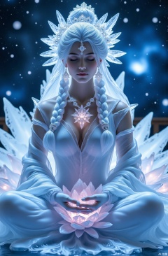 1goddess, celestial ice jewels, eyes closed in a pensive mood, softly out - of - focus, star - shaped ice earrings, sitting in a divine pose, ice - formed peony, flower, ice - star necklace, blurry celestial ice - nebula background, regal bosom, flowing ice - satin dress, full - frontal facing the viewer, long braided tresses, significant depth of field, hair in an elaborate bun, hands placed serenely together, adorned ears, silver - white hair, long, billowing sleeves