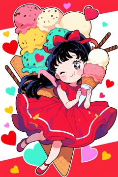1girl,solo,food,red footwear,ponytail,dress,red dress,ribbon,black hair,white background,one eye closed,long hair,ice cream,full body,heart,