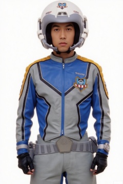 looking at viewer,XIG,helmet,collar,belt,logo,uniform,jacket,pants,gloves,boots,emblem,blue jacket,blue pants,blue jacket with grey line,blue pants with gray line