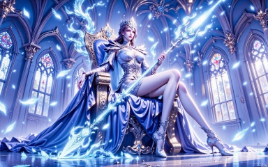 The image depicts a regal figure seated on an ornate throne in a grand, ethereal chamber. The figure is adorned in elaborate, silver-toned armor and a flowing cape, exuding an aura of authority and power. She holds a long, glowing staff, which is positioned diagonally across her body, adding to her commanding presence. The throne is intricately designed, with a high backrest and elaborate carvings, complementing the opulent setting. The background features tall, arched windows with intricate stained glass patterns, allowing soft, ethereal light to filter into the room, casting a magical glow. The overall atmosphere is one of fantasy and majesty, with a focus on the central figure and her commanding presence.