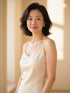 ss,a slender, fair-skinned Asian woman with shoulder-length black hair, wearing a sleeveless, cream-colored satin dress. She stands confidently in a softly lit, beige room with sunlight casting gentle shadows. Her expression is neutral, and she appears relaxed. The image has a minimalist, elegant aesthetic.<lora:SA-T-女性主义_S40.4:1>
