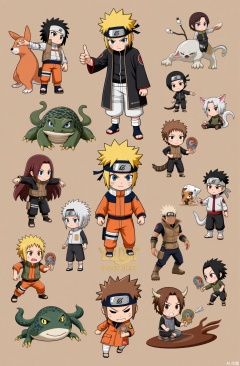 Naruto Uzumaki, headband, male - centered, blond hair, ninja headband, determined look, whisker - like marks, 4 boys, several male companions, ninja sandals, chibi, orange jumpsuit, blue - eyed toad, slanted eyebrows, nine - tailed fox