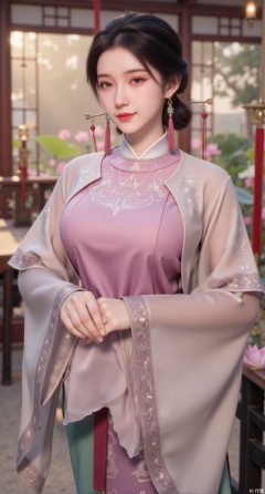 (masterpiece:1.2),best quality, (1girl:1.1), (dress:1.39), on Stomach,aqua_earrings,Lights, lanterns, chang,(big breasts:2.56),hanfu, Best quality, Realistic, photorealistic, masterpiece, extremely detailed CG unity 8k wallpaper, best illumination, best shadow, huge filesize ,(huge breasts:2.69) incredibly absurdres, absurdres, looking at viewer, transparent, smog, gauze, vase, petals, room, ancient Chinese style, detailed background, wide shot background, (((black hair))),(Sitting on the lotus pond porch:1.49) ,(A pond full of pink lotus flowers:1.5),close up of 1girl,Hairpins,hair ornament,hair wings,slim,narrow waist,perfect eyes,beautiful perfect face,pleasant smile,perfect female figure,detailed skin,charming,alluring,seductive,erotic,enchanting,delicate pattern,detailed complex and rich exquisite clothing detail,delicate intricate fabrics,Morning Serenade In the gentle morning glow, (a woman in a pink lotus-patterned Hanfu stands in an indoor courtyard:1.36),(Chinese traditional dragon and phoenix embroidered Hanfu:1.3), admiring the tranquil garden scenery. The lotus-patterned Hanfu, embellished with silver-thread embroidery, is softly illuminated by the morning light. The light mint green Hanfu imparts a sense of calm and freshness, adorned with delicate lotus patterns, with a blurred background to enhance the peaceful atmosphere,Xmupeiling,XsongyuYK,XqiyueFHK,XheguangzhefandiYK,XxiaobaiNZYK,XlimuwanJCBYK,XmeijiK,XzhouruK,XHhanfududou,XzhouruK2,XmeijiK2,XlinziyueK2,Xjinniang2,Xdunhuangfeitian